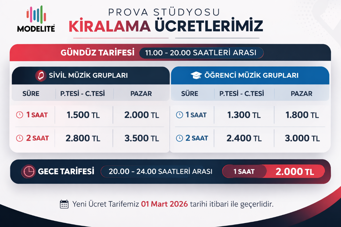 Grubunuzla beraber çalışmalar yapabileceğiniz donanımla hazırladığımız Prova Stüdyomuzda çalışmalarınızı yaparken hem ses kaydı hemde video kaydı almamızı isteyebilirsiniz. Dilerseniz akıllı telefon/tablet/laptopunuzu ses sistemine bağlayabilirsiniz. Ücretsiz “Wireless” ile internete de bağlanabilirsiniz.